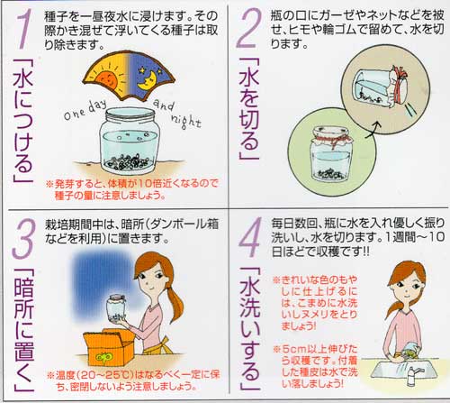 栽培法 スプラウトとして20~28℃ 屋内で1週間程度 畑での栽培は春、秋が作りやすい。