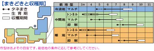 ●中間・暖地では、7月下旬〜8月中旬まき10月収穫の露地抑制栽培も可能。